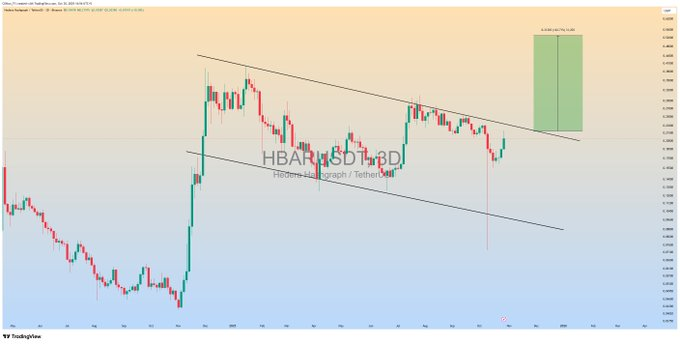 根据分析师Clifton Fx(@clifton_ideas)的最新研判,HBAR/USDT三日周期呈现典型看涨旗形结构,表明Hedera可能正在酝酿延续性上涨。这种形态通常出现在强势上涨脉冲后,反映市场在恢复主要上升趋势前的暂时性盘整。