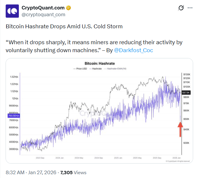 受当前席卷美国的严重风暴影响,比特币哈希率出现下降。自2025年11月以来,随着矿工减少活动,挖矿难度持续降低。一旦矿工恢复盈利,BTC价格有望在长期内迎来反弹。