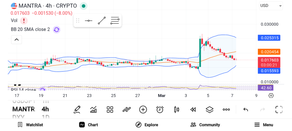 在价格急剧拉升后,Mantra成为本周涨幅最强的币种之一。3月5日,该代币暴涨超20%,一度触及0.02222美元。同期交易活动也呈现爆发式增长。CoinGecko数据显示其日交易量飙升超过1000%,达到约2.37亿美元。如此剧烈的交易量增长通常意味着投资者信心增强和市场参与度提升。近期项目进展推动了本轮上涨:该网络刚完成重大代币迁移,品牌从Mantra OM更名为Mantra后也获得了多家交易所新上架。这些更新吸引了交易者的新一轮关注。过去一周其价格上涨约51%,确认了强劲的看涨动能。