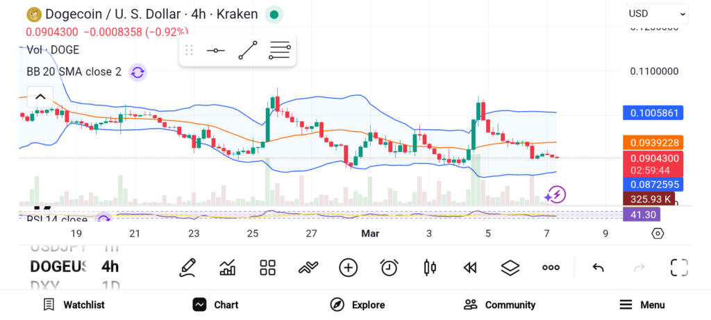 狗狗币也以温和涨幅加入近期市场复苏行列。3月5日该迷因币上涨约3.4%,最新交易时段价格接近0.09619美元。尽管近几周该资产持续阴跌,当前图表信号显示转机可能即将出现。技术指标提示潜在突破形态:日线图布林带持续收窄,这种形态通常在波动率下降时出现,而低波动性往往会在动能回归时引发强劲价格波动。动量指标同样支持看涨前景:MACD指标保持正值,且MACD线始终位于信号线上方,表明买方仍掌控短期动能。