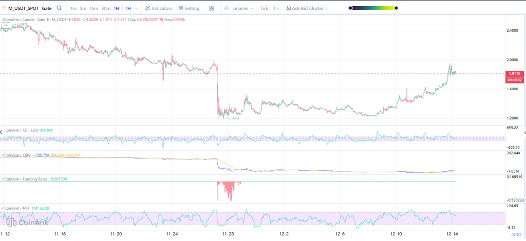 从图表来看,M 代币价格结构出现明显转变。在11月下旬经历大幅抛售后,价格在1.20美元区域附近构筑底部并缓慢回升。近期突破性上涨将价格推回1.80-1.85美元区间,该区域目前构成短期阻力。