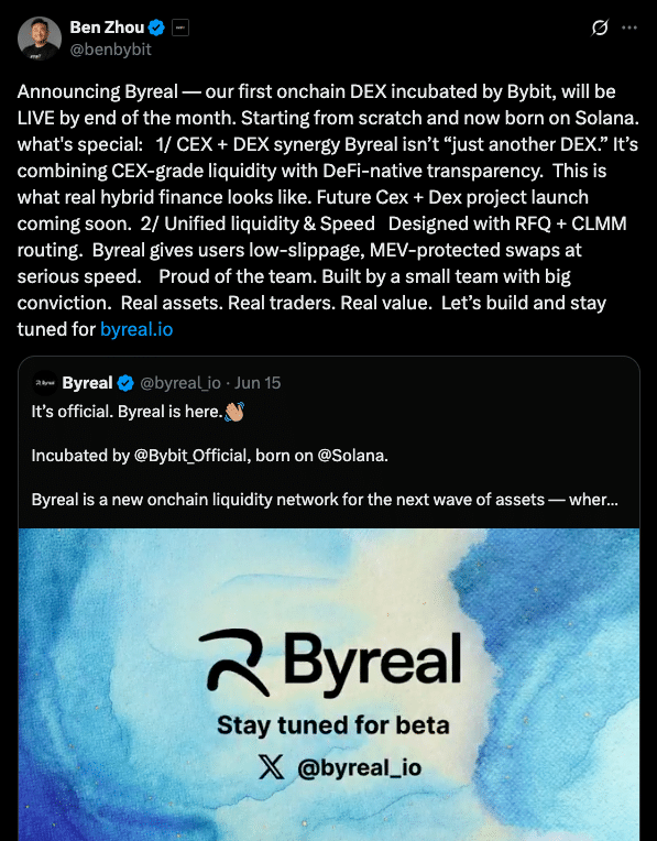 Bybit携首款链上DEX回归:Byreal将于6月30日上线
