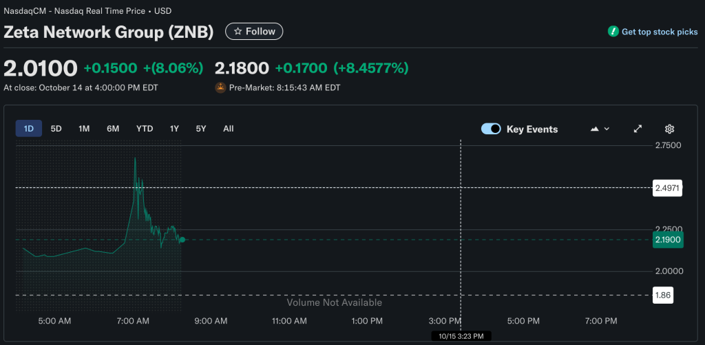 10月14日,Zeta Network集团收盘报2.01美元,在融资消息和资产支持结构公布后上涨8.06%。盘前交易中股价进一步攀升至2.18美元,较前收盘价上涨8.46%。