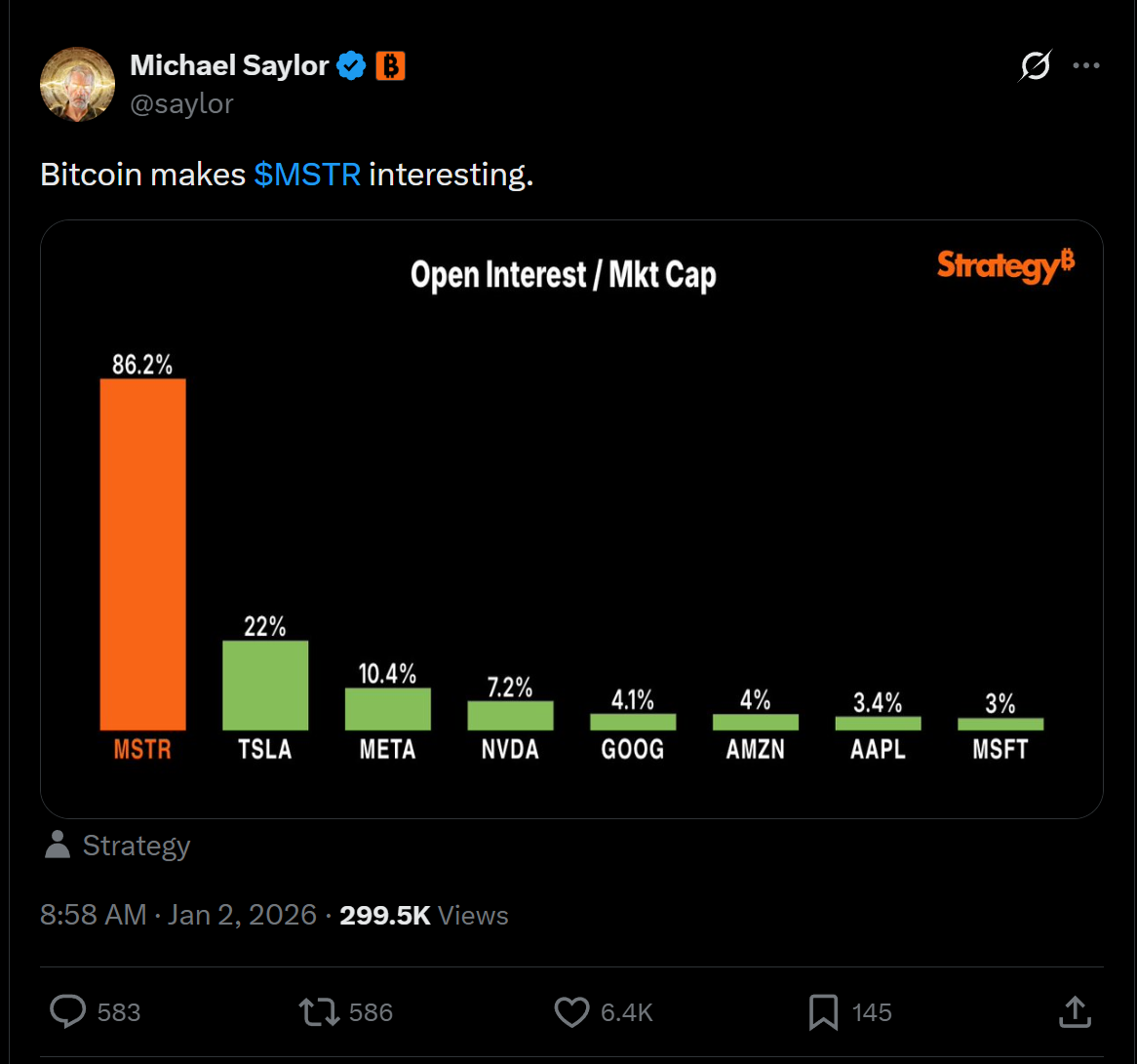 Michael Saylor在比较MSTR与其他科技巨头的未平仓合约名义价值时指出,正是比特币让MSTR变得“有趣”。图表数据显示,MSTR的衍生品未平仓合约与市值比率高达86%,远超特斯拉的22%和微软的3%。Saylor认为,比特币的整合显著提升了这只股票对寻求杠杆化比特币敞口的交易者的吸引力。