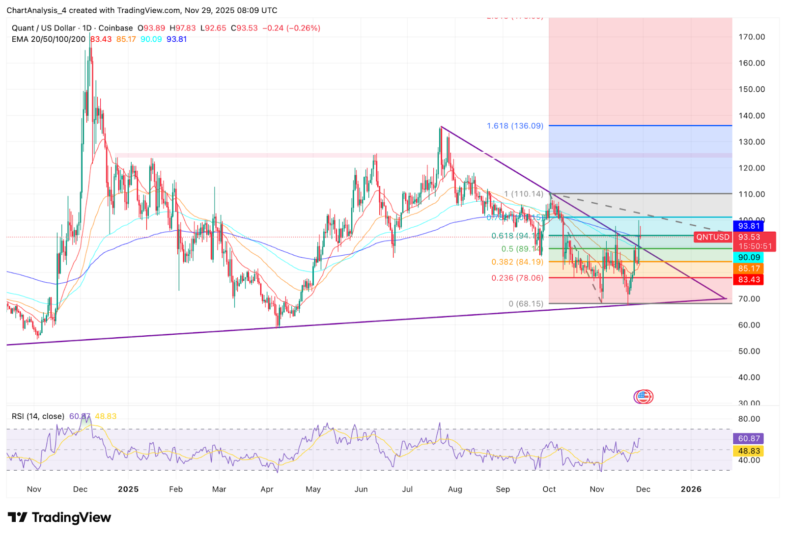 当前Quant报价交投于93.70美元附近,此前未能有效收高于自九月份以来持续压制涨势的下降趋势线。这次回调恰好发生在94.10美元附近的0.618斐波那契区域,该水平近三个月来始终扮演着关键支点角色。