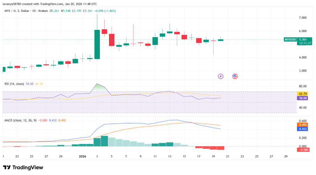 相对强弱指数目前处于58的中性区域,显示MYX Finance既未超买也未超卖,这意味着短期缺乏明确方向性趋势。