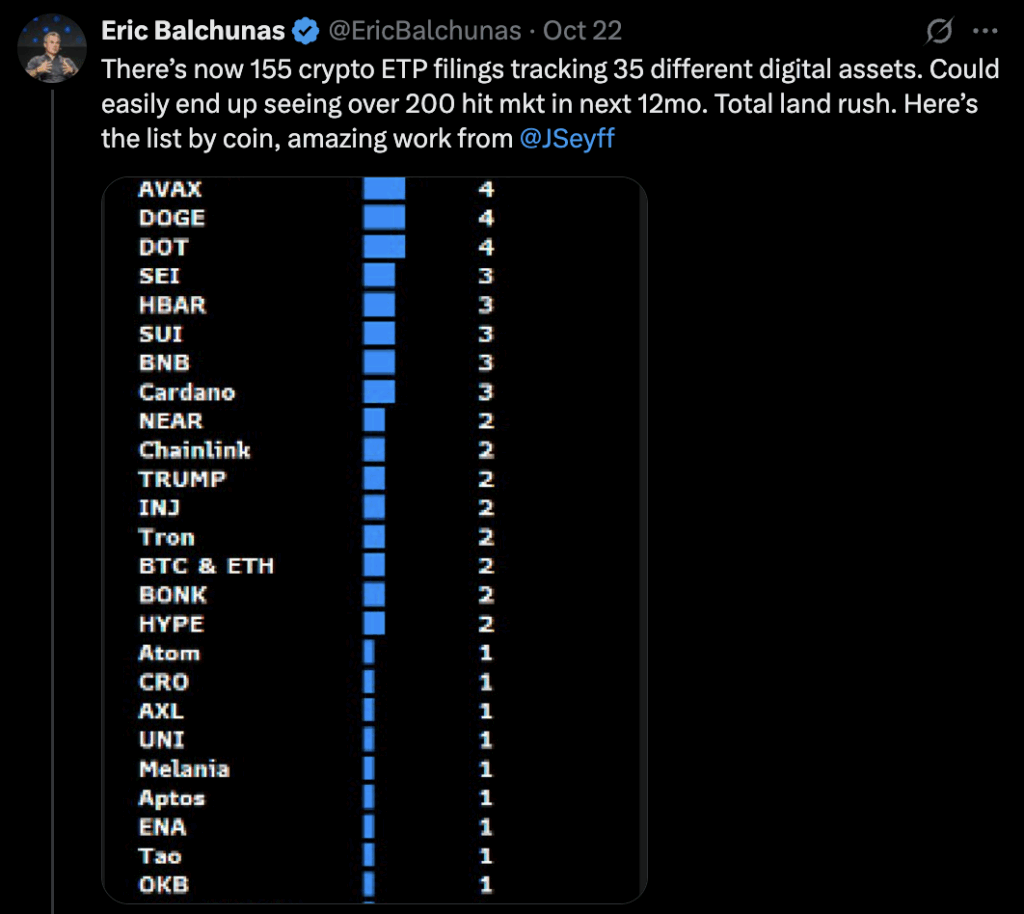 Balchunas披露当前已有追踪35种数字资产的155份加密ETP备案,预计未来12个月将突破200项。这些申请标志着机构产品开发已超越比特币和以太坊,形成"全面抢滩"态势。其中,Solana、比特币和XRP相关申请均超20项,以太坊及一篮子加密ETF产品也突破10项。