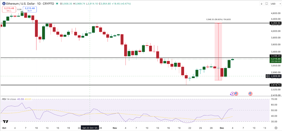 以太坊价格走势与此高度相似:三月突破尝试未果,十一月回落后,于十二月再度触及同一突破线。当前3248美元构成关键阻力位,若日线收于该价位上方,将完美复刻黄金走势,为冲击3600美元乃至4000美元开启通道。