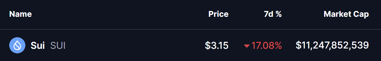加密货币市场延续深度回调走势,比特币(BTC)与以太坊(ETH)本周均录得下跌。其中以太坊跌幅超13%,跌破3950美元关口。随着抛压蔓延至各大山寨币,Layer1代币SUI(SUI)同样面临严峻考验。