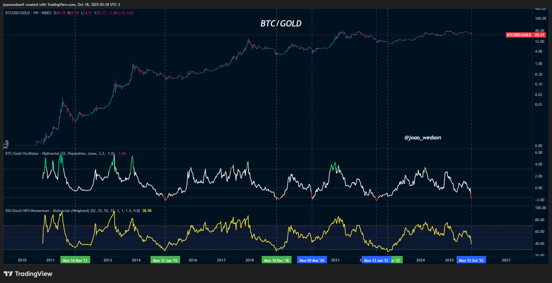 Wedson独创的资产相对强度振荡器正闪现罕见信号,这些信号历来标志着比特币弱势期的终结。"数据明确显示黄金相对于比特币处于超买状态,"分析师指出,这暗示资金可能很快将从传统避险资产转向数字资产。
