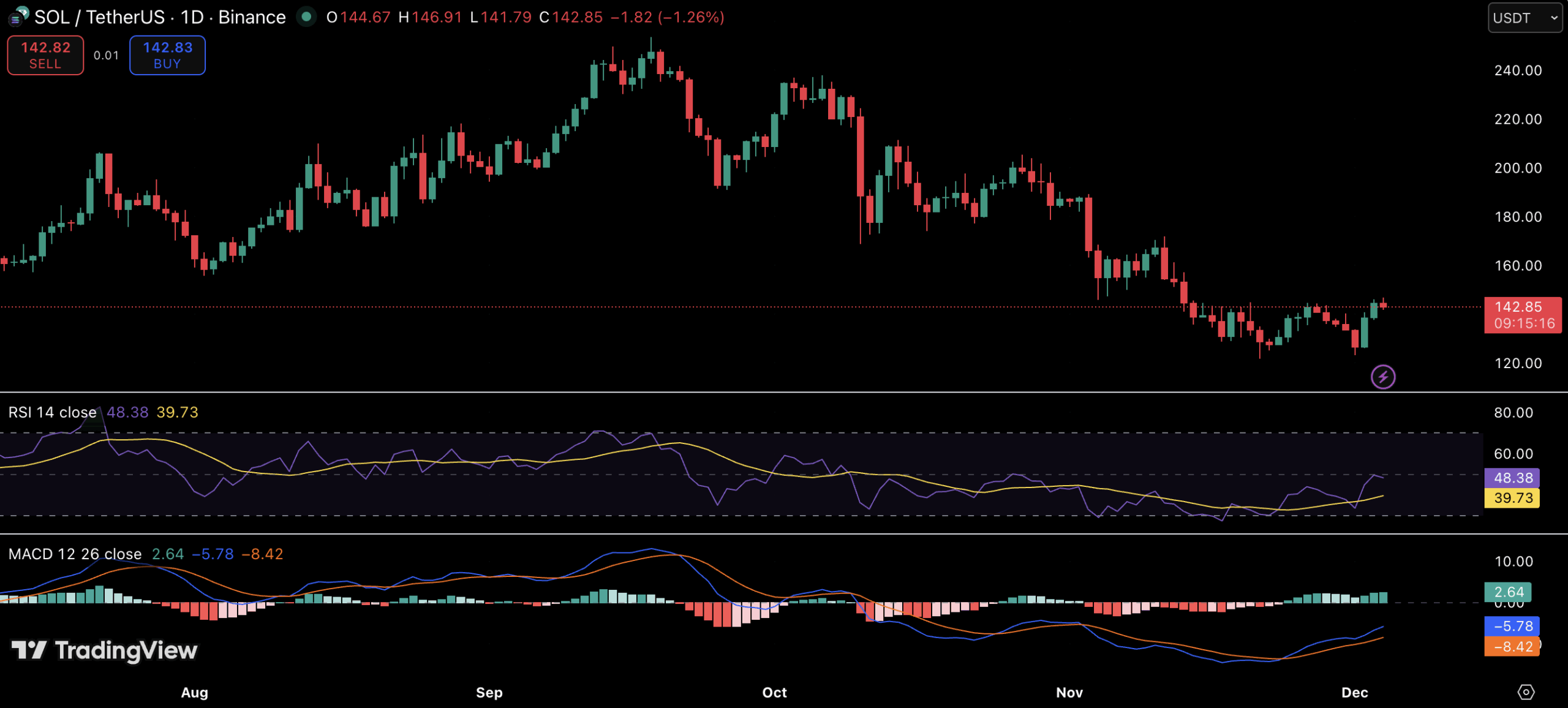 在经历数周持续下跌后,Solana价格走势开始趋稳,SOL正试图收复140-145美元区间。日线图显示买家在118-120美元支撑区附近介入,引发短期反弹。动量指标开始转变:RSI已升至48,脱离超卖区域,同时MACD柱状图翻绿,暗示潜在看涨动能正在积聚。
