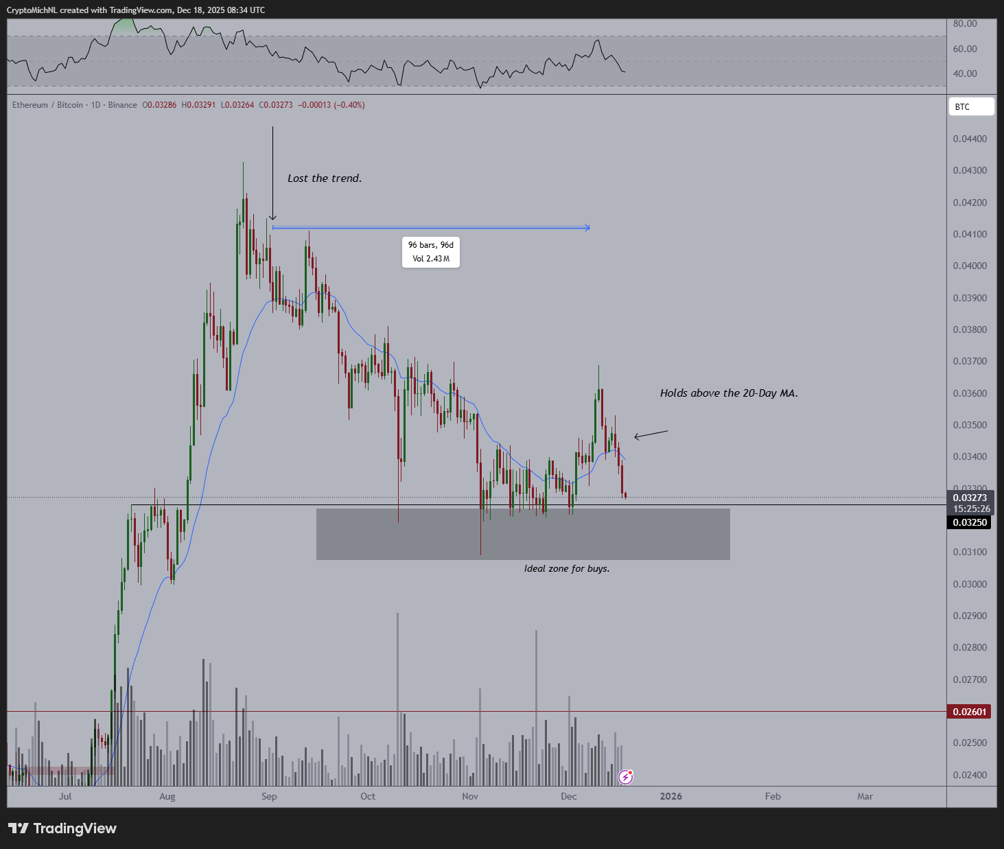 市场分析师Michael Poppe对ETH/BTC交易对当前的急剧抛售提出了不同看法。在接近强劲支撑位的情况下,未来48小时内可能出现暂时反弹。