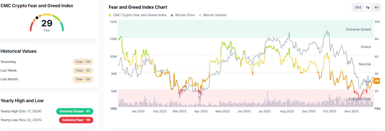 自十月初创纪录的市场暴跌以来,加密投资者对大多数加密货币的投资意愿持续低迷,这种情况不仅限于迷因币领域。根据CoinMarketCap恐惧与贪婪指数显示,虽然投资者情绪已从11月23日记录的10「极度恐惧」小幅回升至当前29的「恐惧」水平,但仍远低于10月7日190亿美元加密市场崩盘前62的「贪婪」数值。