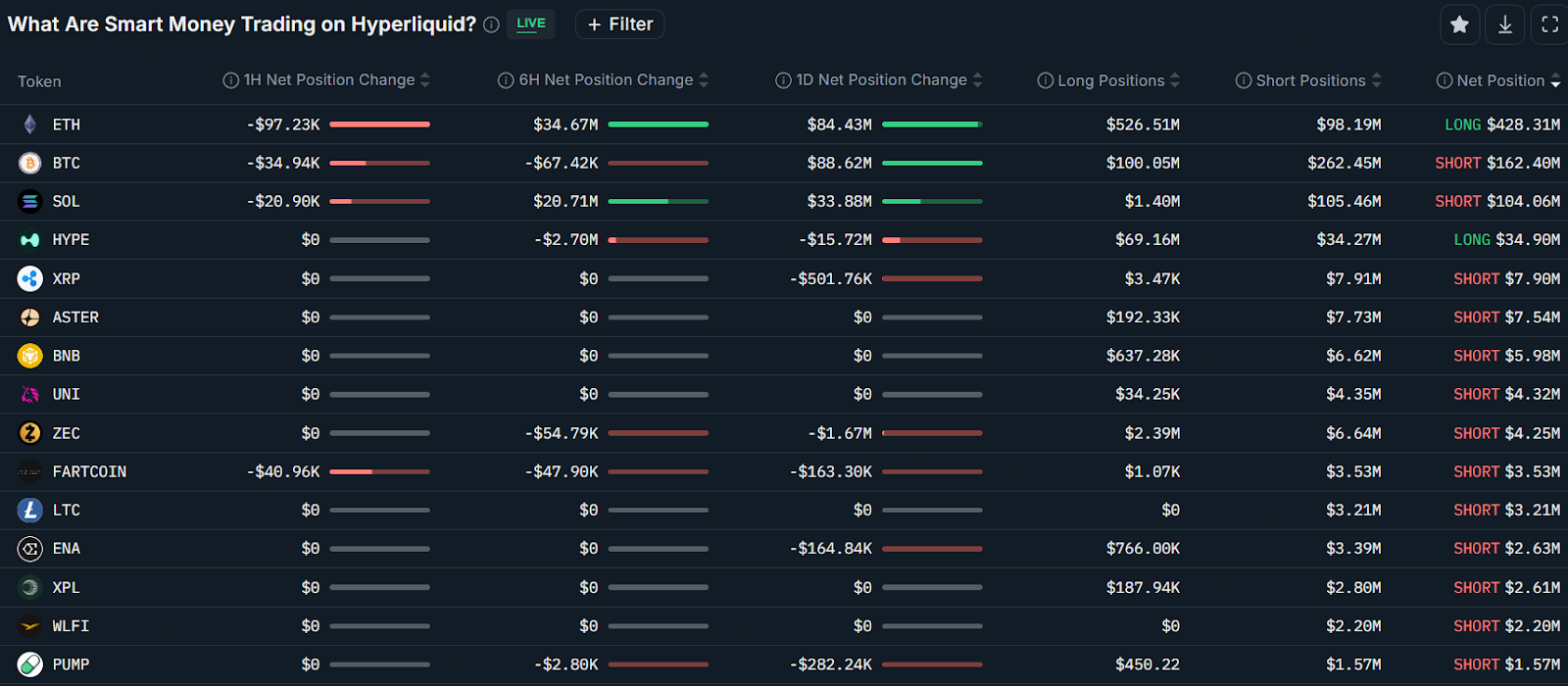 聪明钱交易员在Hyperliquid的永续合约头寸分布。来源:南森