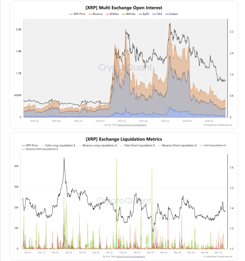 这种行为表明,尽管衍生品市场杠杆头寸崩溃,但资金雄厚的参与者看到了收集或巩固头寸的价值。CryptoQuant的一份报告支持了这一观点,指出各交易所XRP未平仓合约大幅下降,而币安仍在期货市场占据主导地位,表明杠杆头寸正在广泛平仓。巨鲸积累和交易所层面未平仓合约的综合视角,强化了XRP巨鲸活动为何能提振对ETF持仓的信心,并锚定市场稳定性的原因。