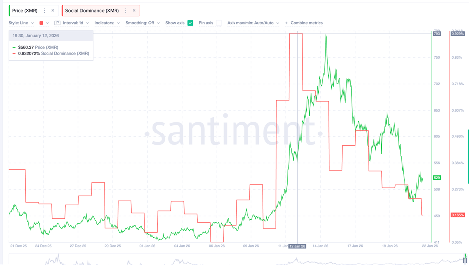 这传达了一个简单的信息:当前讨论门罗币的新增用户正在减少。讨论减少意味着新买家流入放缓,XMR价格虽仍可能上涨,但阻力更大。这并非意味着兴趣永久消失,仅表明一月初的狂热已经降温。