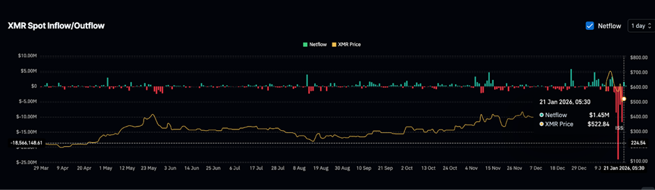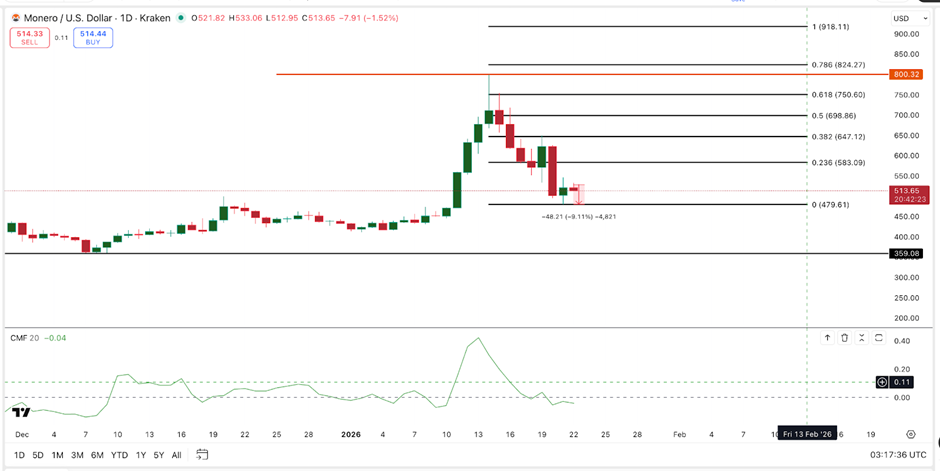 然而,这种快速上涨未能持续。触及高点后,门罗币价格开始回落。虽未出现崩盘,但涨幅被逐步回吐。目前XMR交易价格在520美元附近,这意味着该加密货币已回吐约三分之一的1月涨幅。