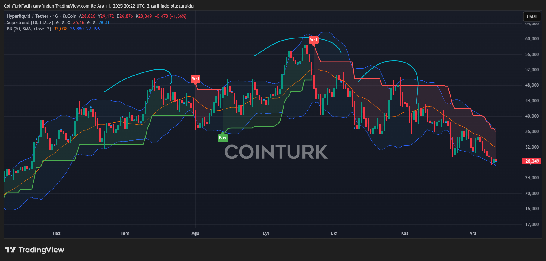 “HYPE正从一个扩张性头肩顶形态的高位结构下行。目前价格处于28美元颈线附近,动能持续减弱。RSI在右肩呈现较低高点,近期反弹尝试显示成交量低迷,表明买家正失去控制。若颈线破位,预计将进一步下跌。”