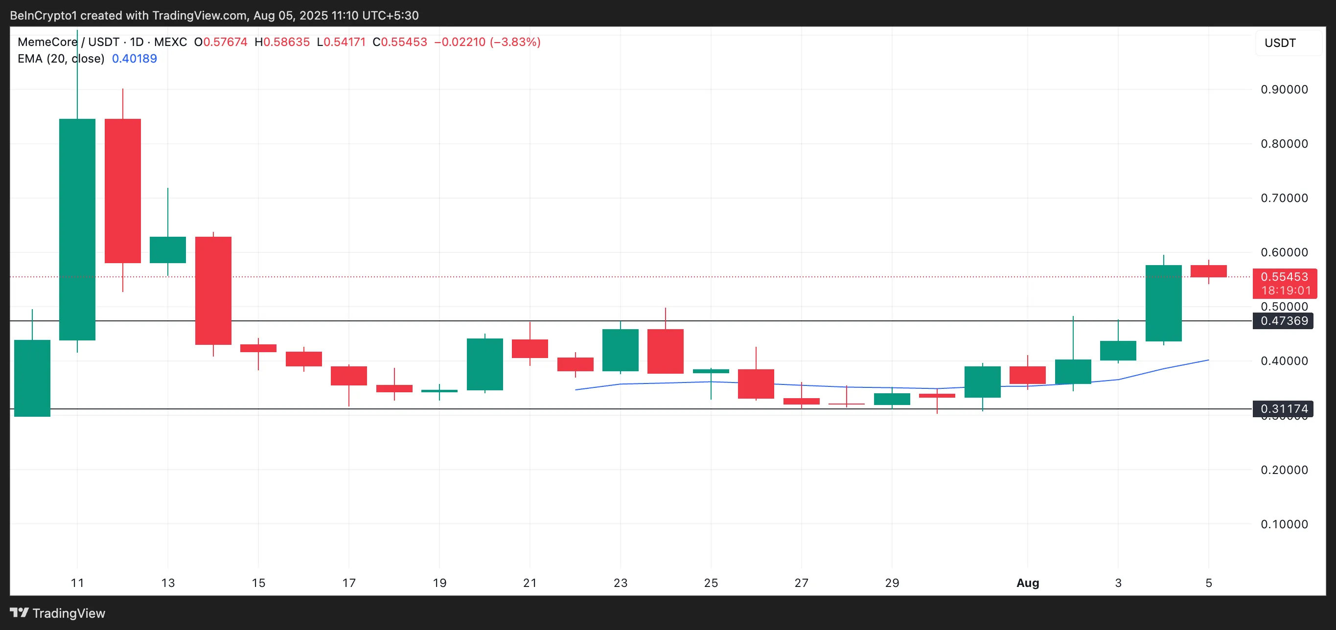 当前M价格0.55美元已站稳20日指数移动平均线(EMA)上方,该动态支撑位现位于0.40美元。当资产价格高于20日EMA时,往往意味着短期看涨动能增强且买方占据主导。