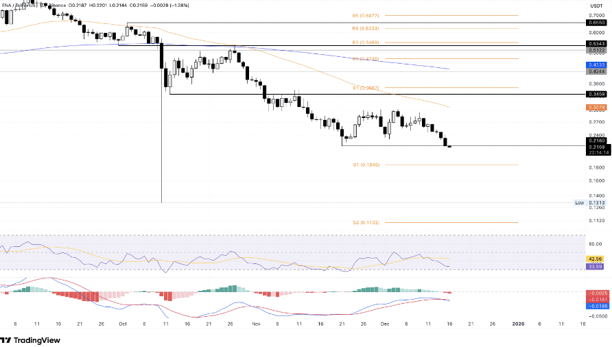 与此同时,相对强弱指数(RSI)已降至33,接近超卖区域。移动平均收敛散度(MACD)指标也转为看跌,信号线现处于MACD线下方。这些技术指标显示看跌动能正在增强,表明若ENA未能实现反弹,可能面临更大下行空间。