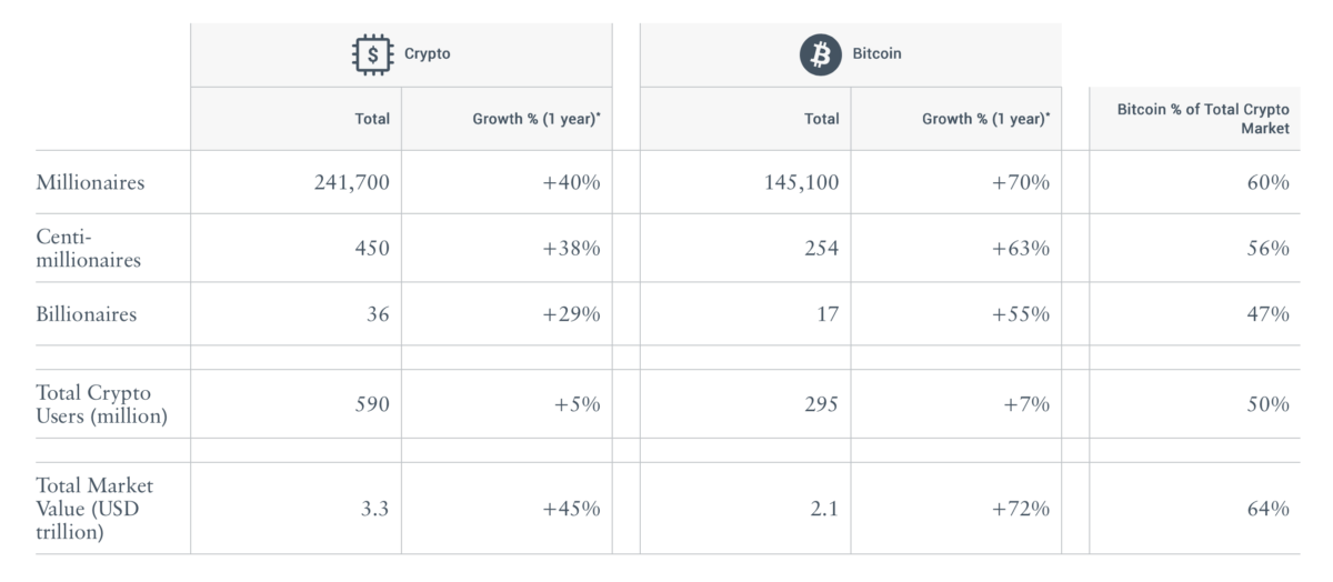 报告进一步指出,目前有450人持有超过1亿美元的加密资产,同比增长38%。报告将这种现象描述为"历史性"的财富激增,这得益于机构投资者对市场的关注以及全球使用率的提升。整体而言,全球约5.9亿人(约占世界人口的7.4%)持有加密货币,其中2.95亿人持有比特币。但根据瑞银数据,加密货币百万富翁仅占全球6000万百万富翁的0.4%。
