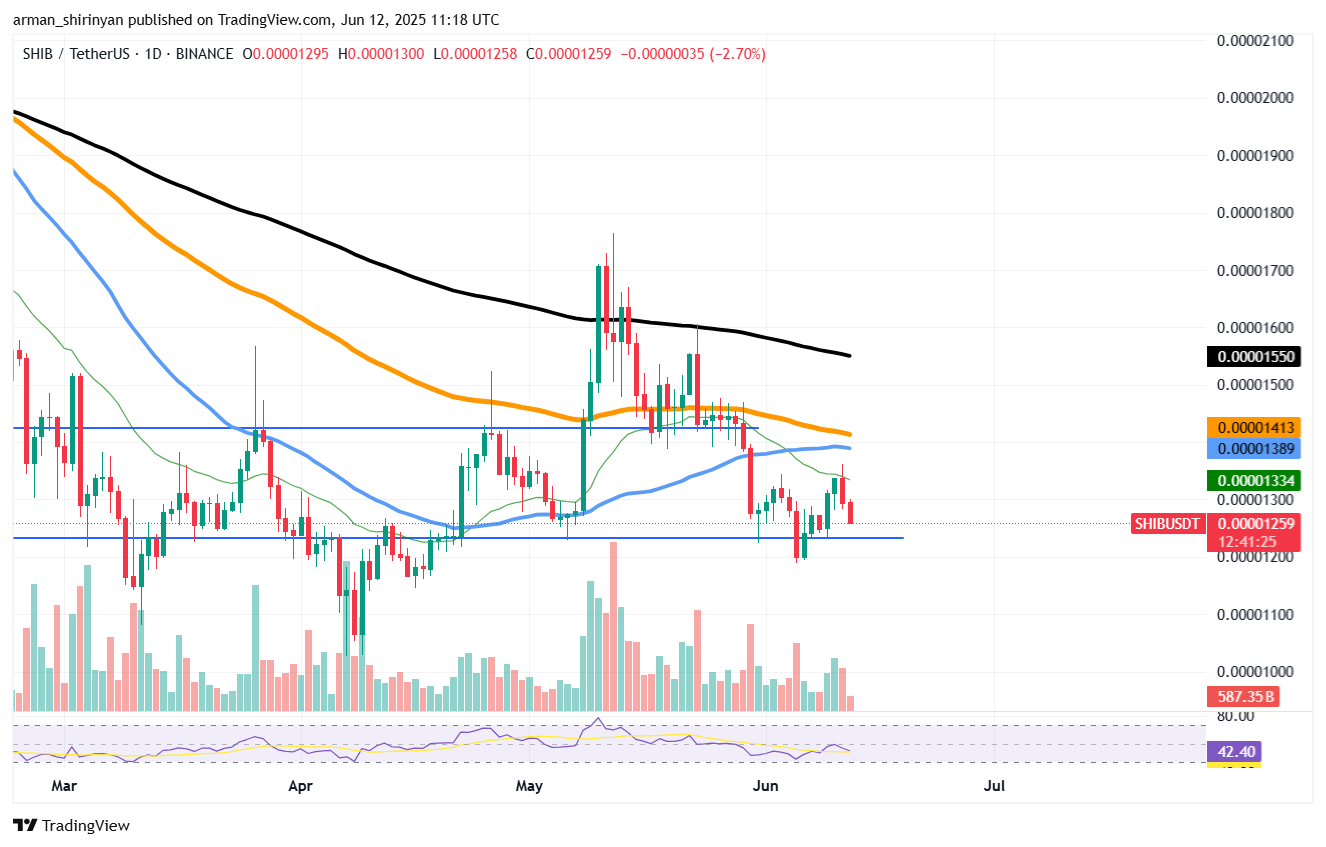 当前SHIB处于基础支撑位的定位至关重要。0.00001250-0.00001280美元区间既是算法支撑区,也是零售交易者的心理防线,自四月以来已历经多次测试。若跌破该水平,特别是伴随交易量再度萎缩,可能导致价格加速滑向0.00001100美元甚至更低。