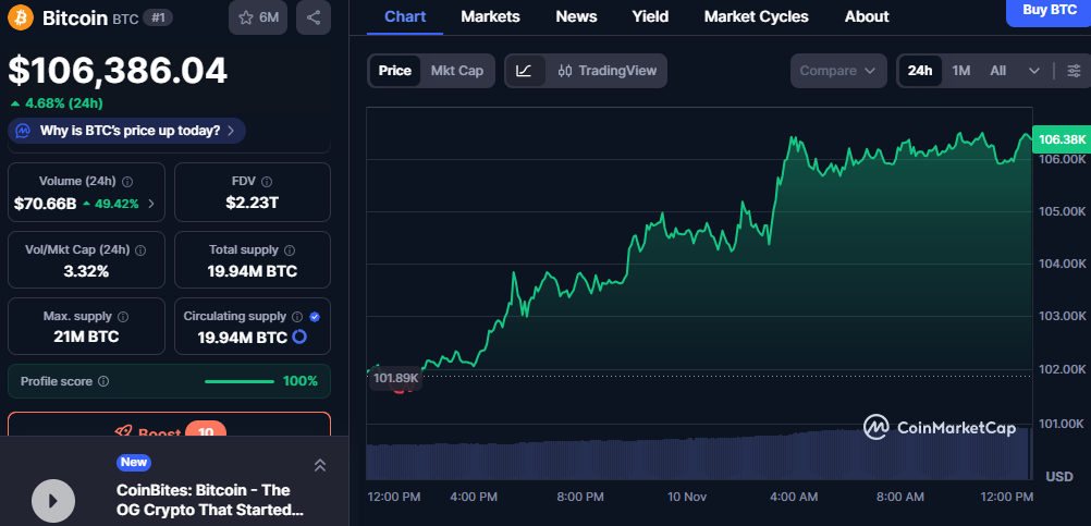 在24小时内上涨约5%后,比特币目前交投于106,386美元附近。从101,890美元起步的这轮上涨形成了逐步抬高的低点和高点。如今比特币在105,000美元上方确立新区间,市场正在评估下一步走势。