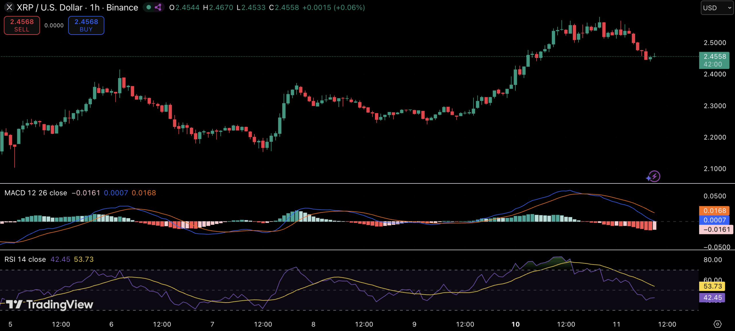 XRP现交易于2.45美元附近,近期上涨后呈现企稳迹象。图表显示强劲上行后的短期盘整,而RSI(42.4)等技术指标表明超买后的冷却阶段。