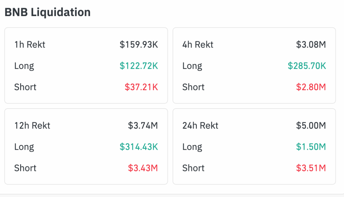 Coinglass数据显示,过去24小时内BNB合约爆仓金额约500万美元。其中空头损失占据主导,空单爆仓351万美元,多单爆仓150万美元。