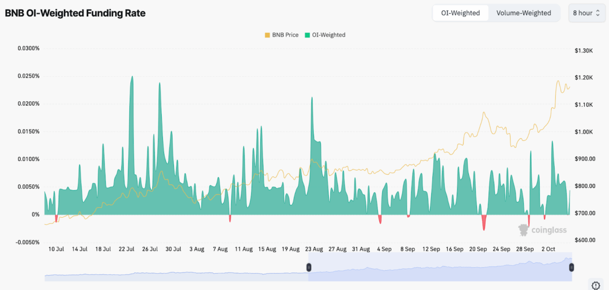 尽管在8月初和9月中旬,资金费率曾短暂跌破零值,显示空头短暂掌控局面,但市场很快重拾看涨情绪,反映出投资者对BNB增长的信心。