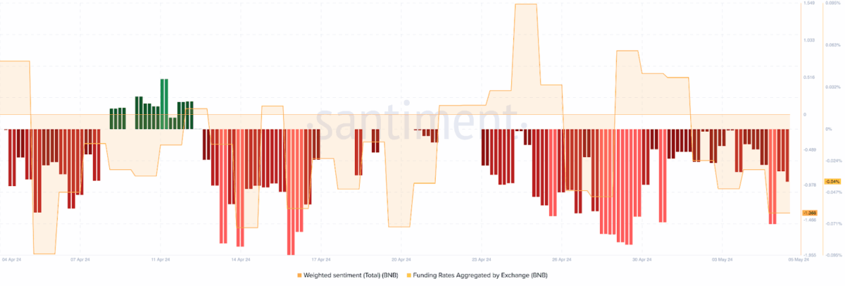 Santiment数据显示,2024年3月末至5月初期间,BNB投资者情绪呈现下行趋势。当时资金费率持续为负,加权情绪指标多数时间低于零值。但近期价格走势已扭转这一局面。