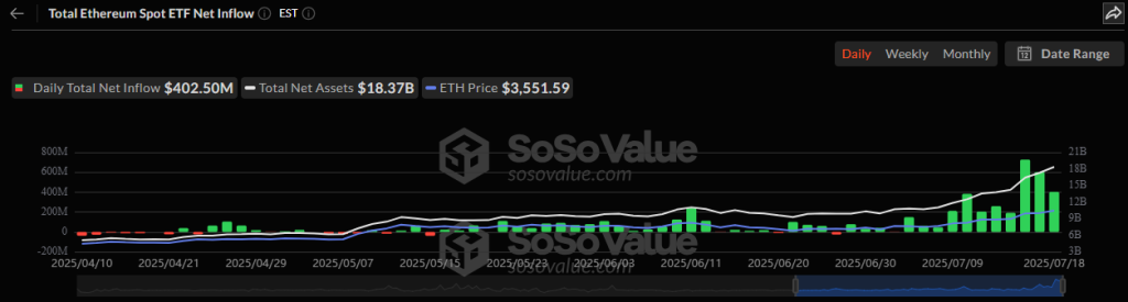 七月ETH价格飙升的核心动因之一是美国现货以太坊ETF的资金大规模涌入。这些机构产品在七月中旬创下历史性交易记录——仅7月16日单日净流入就高达7.27亿美元,创当月峰值。其中
