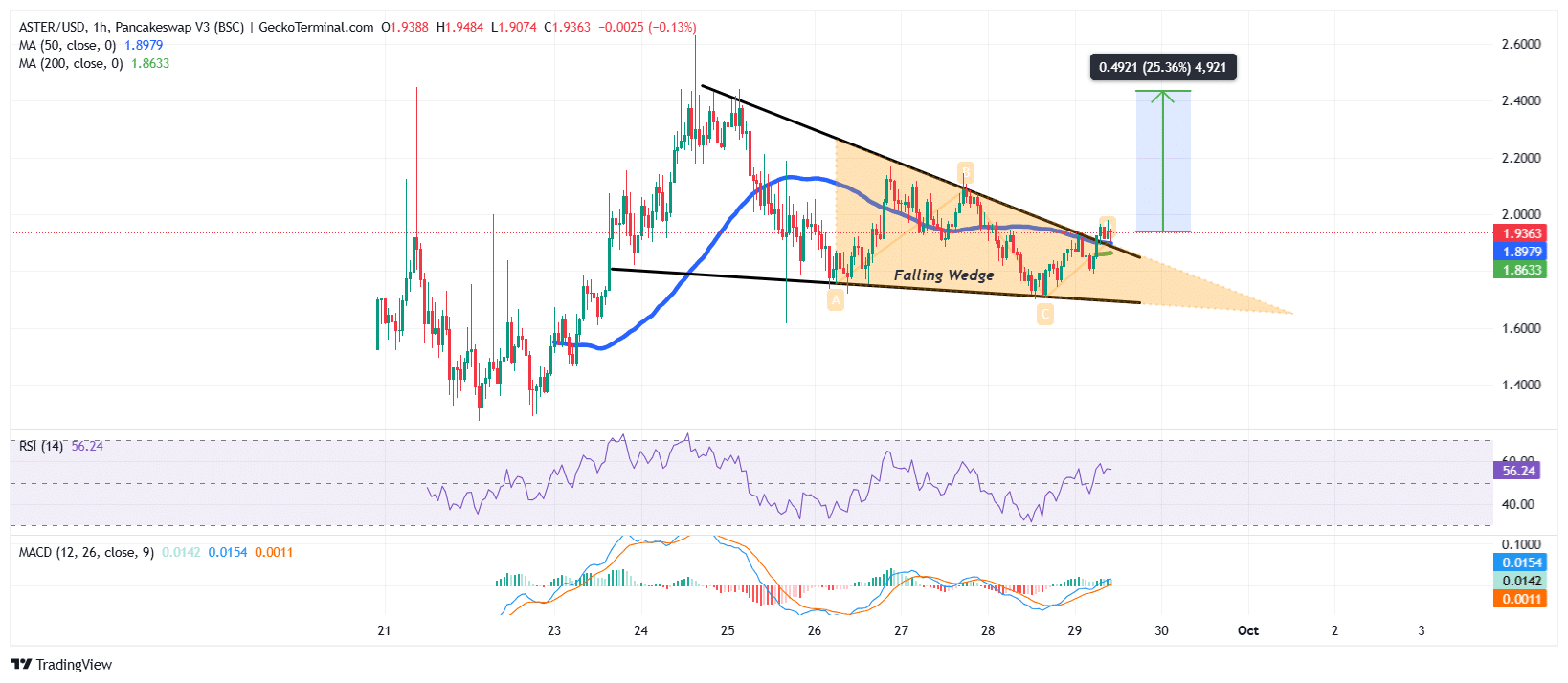 1小时图表显示ASTER价格形成教科书般的下降楔形形态——通常被视为看涨反转信号。该形态由连续降低的高点和低点构成,最终价格成功突破下降阻力线,预示潜在上涨动能。