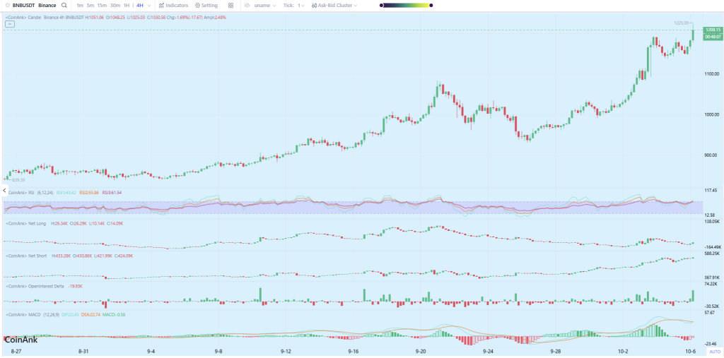 观察4小时图表,BNB在9月下旬呈现出900至1000美元之间的短暂盘整阶段。这种横盘走势为市场提供了调整空间,随后买家重新入场推动价格在10月初爆发性上涨。突破1100美元后触发新一波多头建仓,动能将其推至1200美元上方的未知领域。