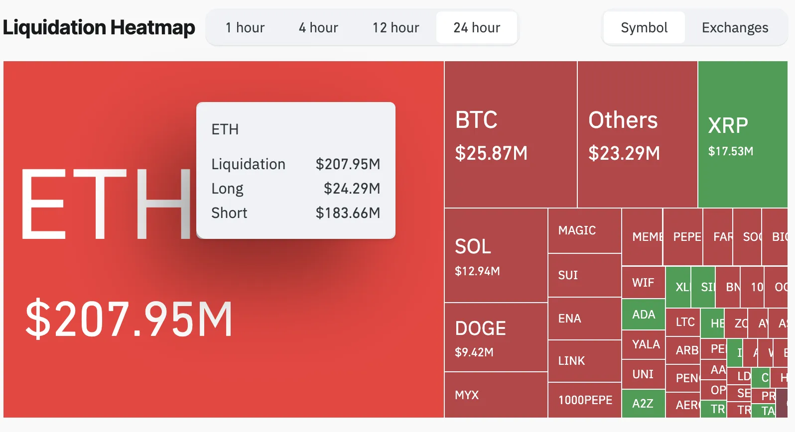 过去一周,市场对ETH的新增需求推动其价格上涨18%。强劲的买盘动能与改善的市场情绪共同作用,最终促成昨日价格突破关键位,导致大量空头仓位被迫平仓。Coinglass数据显示,过去24小时内空头平仓总额达1.84亿美元,而多头平仓金额相对温和,仅约2400万美元。这突显了在价格急速上涨中,交易者争相回补仓位的激烈程度。