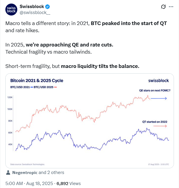 Swissblock最新研报指出,当前周线收盘表现疲软,若无法逆转趋势,近月涨势或将受限。图表显示2025周期与2021年见顶形态存在相似性——当时比特币创历史新高后急转直下。