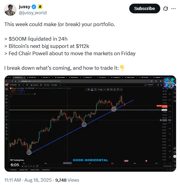 交易者密切关注112,000美元支撑位,静待8月22日鲍威尔讲话。