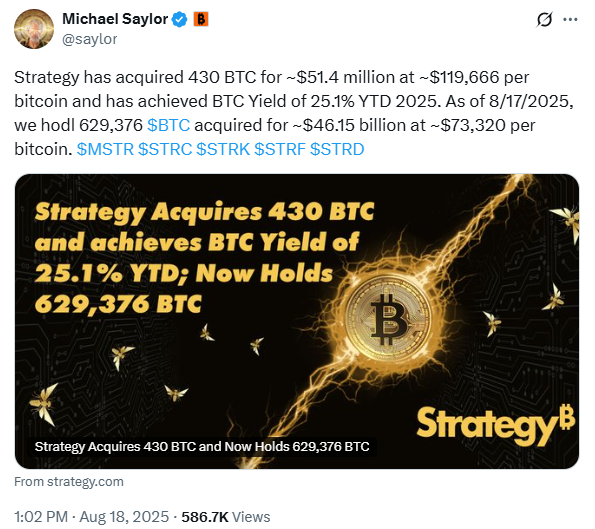 上市公司Strategy通过SEC文件披露,以11.96万美元均价豪掷5140万美元购入430枚比特币。