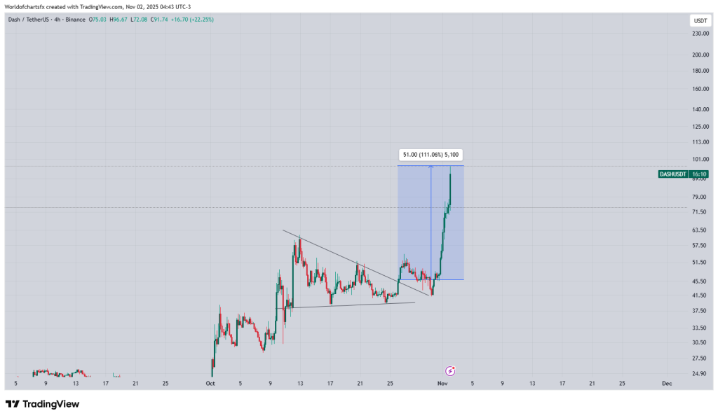 World Of Charts的短期图表分析显示,达世币在突破下降楔形后始终保持强势。每次回调幅度都很有限,买盘迅速承接,这种形态通常意味着市场信心恢复,交易者愿意在更高价位建仓。