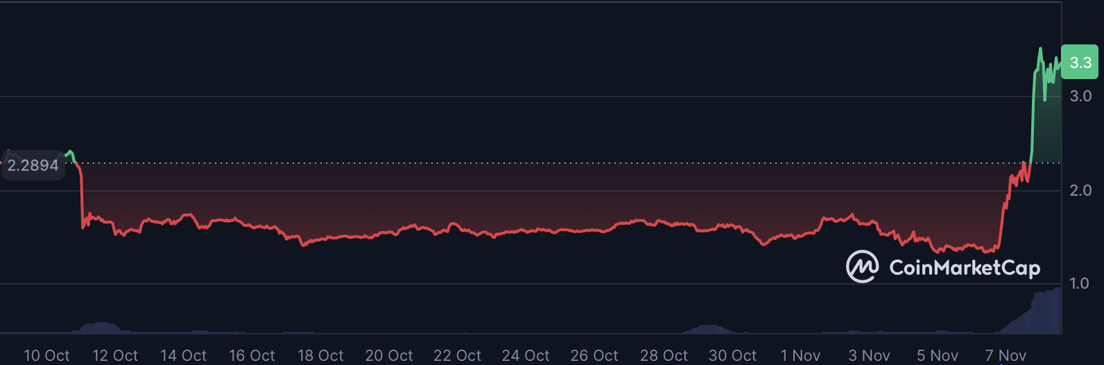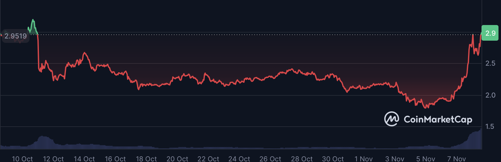 。交易量单日暴增116%,反映出大资金对11月13-15日FIL开发者峰会的预期。技术面黄金交叉形态进一步强化看涨信号。后市需观察峰会结束后3.20美元能否转化为支撑位,这将是维持涨势的关键考验。
