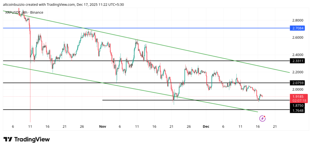图表显示需保持谨慎。XRP虽在支撑位附近震荡收缩,但价格在2.1美元下方仍由空头掌控趋势。