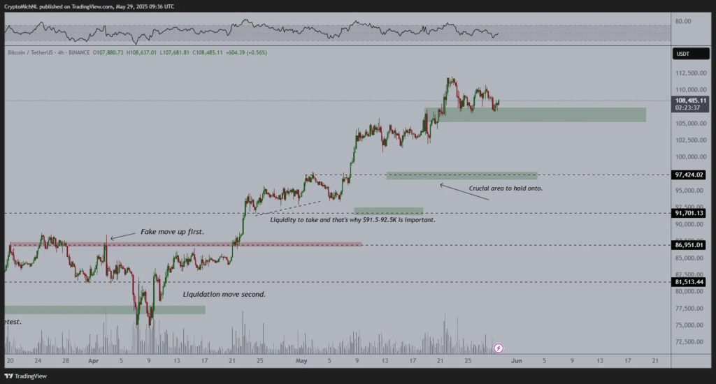 分析师Michael van de Poppe指出,当比特币测试10.7万美元支撑位时,后续走势可能不会平稳。他在社交媒体发文中强调,虽然比特币价格保持"向上磨底"态势,但107,000美元是重要支撑位。