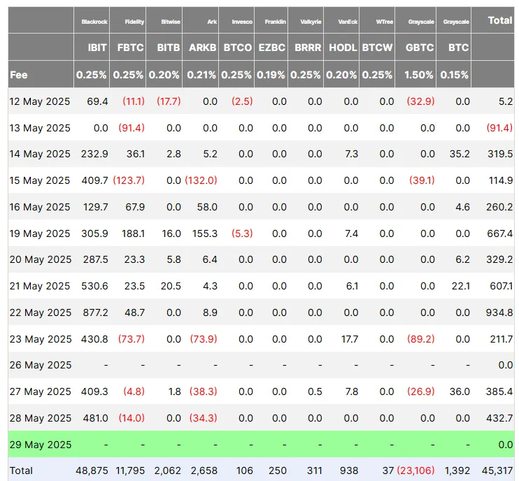 近期资金流入显示机构仍在重押比特币。Farside Investors数据显示,5月28日美国现货比特币ETF单日净流入4.327亿美元,其中仅贝莱德IBIT就贡献4.81亿美元。