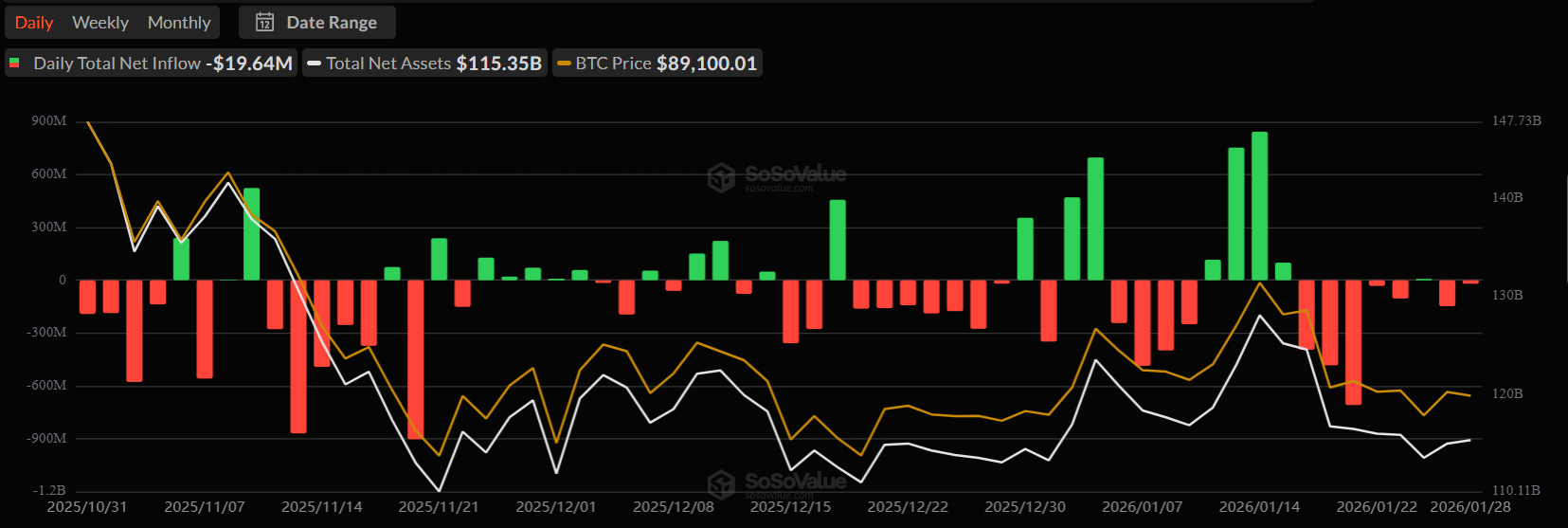 机构对BTC的兴趣仍显疲软。据SoSoValue数据显示,美国BTC ETF于1月28日再现资金流出,净流出额超1960万美元,而前一日加密货币产品流出规模逾1.47亿美元。
