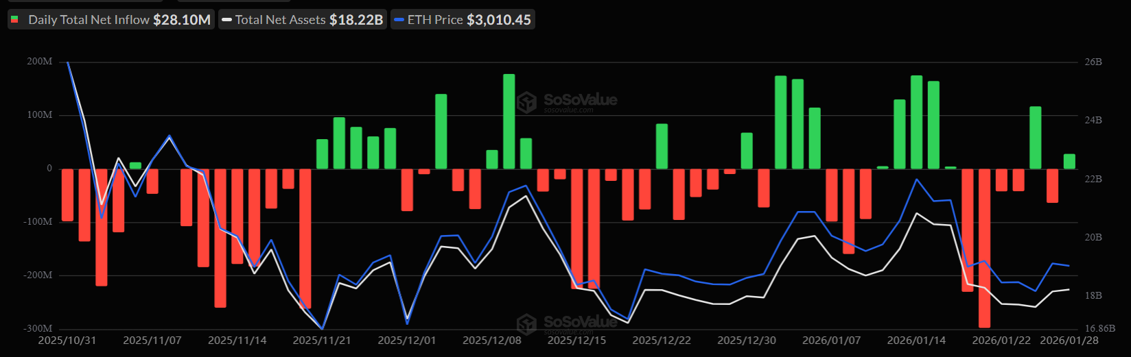 但与BTC ETF形成对比的是,美国ETH ETF在经历前日流出后,于1月28日实现超2800万美元资金流入。