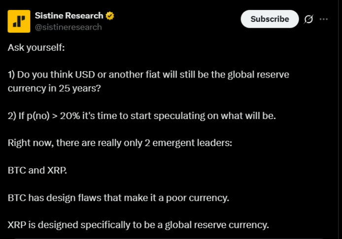 Sistine将BTC与XRP视为未来全球储备货币候选 | 图片来源:X