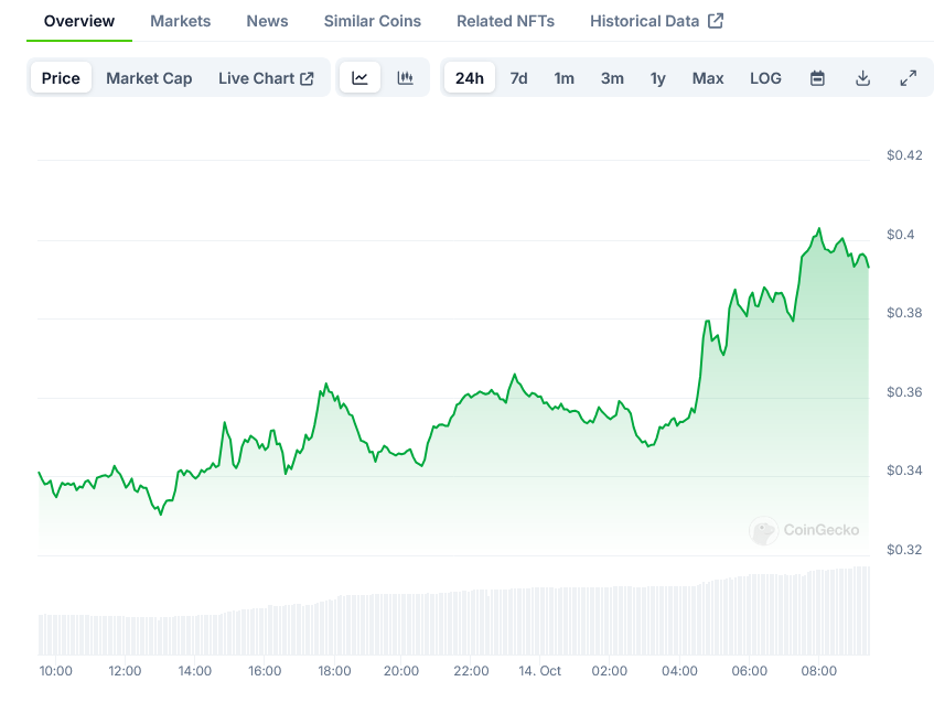 该提案的消息对Ethena的原生代币ENA的价格产生了重大影响。公告发布后,ENA的价格飙升17%,达到0.39美元,推动其市值突破10亿美元。这一价格走势反映了投资者对Ethena生态系统日益增长的兴趣以及Solana支持提案的潜在影响。