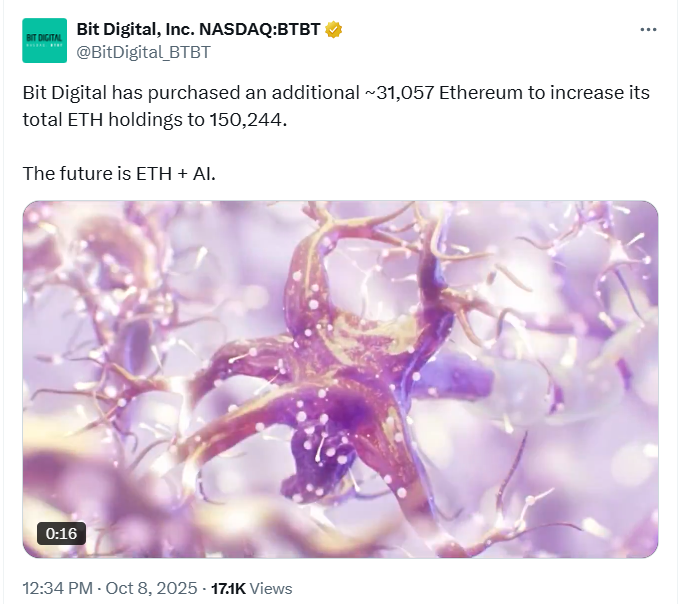 以太坊突发新闻:Bit Digital公司正通过最新投资推动以太坊资产储备战略。10月8日发布的公告显示,该公司通过新购入31,057枚ETH扩大了持仓规模。此次收购使其以太坊总储备量跃居顶级机构持有者行列。