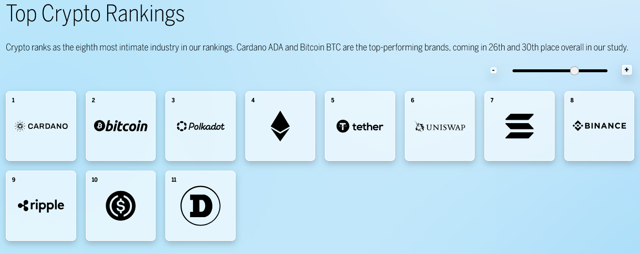 根据Brand Intimacy最新报告,Cardano在品牌认知度方面超越了比特币,其品牌指数达到52.6,超过比特币的51.9。Cardano在全球企业品牌排名中位列第26位,超越了沃尔玛、丰田等知名企业。
