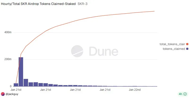 接收者有90天的时间直接通过其Seed Vault钱包申领代币。在最初的29小时内,用户通过55,246笔交易抢占了约15亿枚SKR代币。